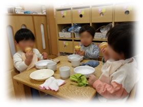 ひよこ組でも食事やおやつをお友達と一緒に食べています!子どもたちは手を洗い椅子に座ると自分のエプロンをすぐにつけ楽しみにお友達と笑い合いながら待っています♪ごはんがテーブルに出てくるとそれぞれのペースで黙々と食べているのです☆
