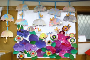 きりん組は好きな色を選んでマーブリング。傘を作りました。
