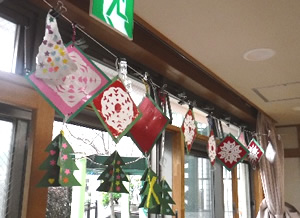 街ではジングルベルが聞こえるようになりました。お部屋には、クリスマスのリースや雪の結晶を飾りましたよ。