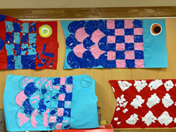 グループでこいのぼりの身体の部分の色を2色まで決め、その上にマスキングテープを自由に貼っていきます。そのテープの上から自分の好きな色を塗っていき、マスキングテープを剥がすとこいのぼりの鱗のようになるという製作です。