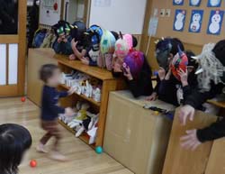 ぞう組鬼は、乳児クラスを回るのですが、今年のぞう組鬼はとてもやさしい鬼で、声を出して驚かせるよう子は少なく、少しするとすぐにお面を外し、「ぞう組だよ~!」と教えてあげていました。ぞう組鬼に泣いてしまった子も、いつも遊んでくれるお兄さんお姉さんだとわかると安心していました。