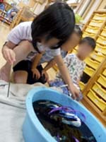 年長児と同じように何かしてあげたい、教えてあげたい、という気持ちがあるようで、こちらもお世話をやいています。