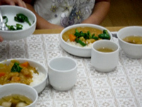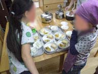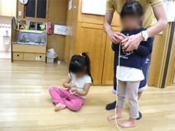 やることがわからなかったり、困っている3歳の子がいると、「こっちだよ」「やってあげる」など、年長の子がお手伝い。