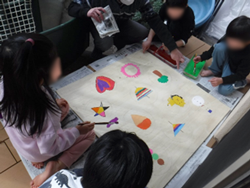 おやつ後から帰りの会までの数分のこと、まだ片付いていないテーブルが多かったからか、床で始める子がたくさんいました!早く“やりたい!”という意欲的な姿を感じます!(いつもは机でやっています。)