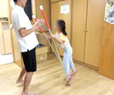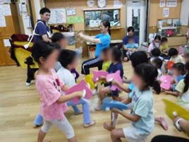 じめっとした天気が多く、室内での遊びが増えました。奥を動的スペースとしていることで、雨の日も身体を使った遊びやリズム遊びを楽しんでいます。今月はいよいよぞう組合宿があります。合宿中の当番やBBQで食べたいものを決める話し合いをしたり、Tシャツを染めたりとさまざまな取り組みをしてきたぞう組、そんな姿を見ていたきりん組は“ぞう組がいない間の配膳当番を頑張る”と張り切っています。