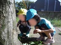 まずは何を食べるのか考えるところから。子どもたちからは「ダンゴムシとか?」「幼虫とか」と声が上がります。そこで図鑑で調べてみると生きている虫などを食べるということが分かりました。それを聞いて「逃がしてあげた方が自由になれるよ…自由に食べ物を探しにいけるよ」と言う子が。けれど虫好きの子や捕まえた子たちは「やだ!」と納得いきません。「いらない幼虫を餌にするとか?」「ツマグロヒョウモンとか?」と言う声が上がると、「え~!やだよ!」とツマグロヒョウモンを捕まえてきた子が言います。そこまでするなら逃がそうか…と大半の子は思っていましたがどうしても飼いたい子たちがゆずりません。「じゃあ生きてる虫を探す?ダンゴムシとか」「ありとかは?」という話になり、そこでもう一度図鑑を確認。保育士が「街頭に集まる虫などを食べるって書いてある」と言うと、「電気が光ってるとこ?じゃあ飛んでる虫だ」「じゃあ蚊とか蛾を探しに行く」ということで、遊歩道グループとテラスグループに分かれて飛んでいる虫を捕まえに行くことにしました。時間制限は17時まで。それまでにどのくらいの虫が必要なのか考えると「土日もあるから~(その日は金曜日でした)」「40匹ぐらい!?」「そうしよう!」と決まりました。