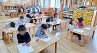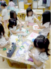 お絵かきコーナーでは、5歳児の子が描いているお姫様を、4歳児の子が「かいて~」と言い、「いいよー」と描いてあげる姿があり、4歳児の子はまた3歳児の子に描いてあげている、なんて様子もとても微笑ましいです。