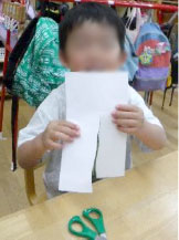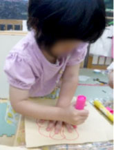 はさみを使って自分で切ることが出来るようになるとそれが楽しくて仕方なくてA君は自分ではさみで切った紙を「みてー!ズボン」と自信満々に見せてくれます。Aちゃんは自分の手を紙の上に置いてマジックペンでなぞっていました。他にも、ネックレスやカード、くるくる剣などなど楽しそうに夢中で作っています。