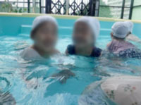 次の日、「保母と一緒に泳いでみようか?」と泳ぐ保母の背中に 乗って一緒に水中へ。そこで笑顔が少しずつ見えてきました。