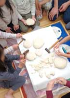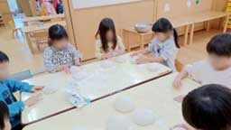 年末のもちつきでついた餅をぞう組が鏡餅を作り、各保育室や玄関に飾り、1月に鏡開きをしました。鏡餅とはなにか、子どもたちに話をしていくと子どもたちになりに受け取って考えながら取り組んでいました。