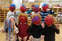 今年度もぞう組(5歳児)は鬼のお面を作りました。風船に新聞紙を何枚も重ねて貼っていき、硬いお面を作りました。顔の色はそれぞれが決めたのですが、皆お揃いの赤鬼になりました。