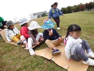 虫網を握り、「虫さん捕まえるぞー!」と張り切るYくん、Sくん。虫のことが大好きで、初めて見る虫でも勇気を出して触っています。CちゃんとDくんは2人でしゃがみこんで「ドングリあるかなぁ」「綺麗な葉っぱあったよ」と、秋ならではの落下物を探しています。