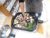 沢山出来たので一人数個 ずつ大きいものを収穫していく。「やわらかい!」「フワフワしてるね」など子どもたちが感触を楽しんでいる。大人が「匂いも嗅いでみて」と声をかけると「くさいね」「きのこの匂いだね」と匂いを確かめている。 ホットプレートで子どもたちの目の前で調理開始。「いい匂いがしてきた」「おいしそう」と子どもたちもどんな味になるか想像しながら調味料で味付けしていく。出来上がるころには早く食べてみたい気持ちでいっぱいになっていた。